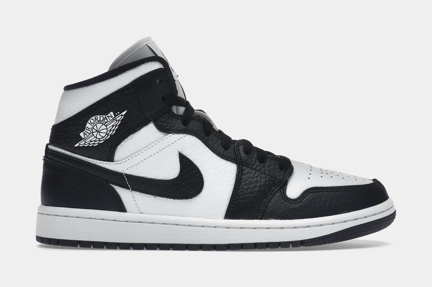 This offering of the mid-top Air Jordan 1 comes constructed in a full tumbled leather build featuring a White base with Black overlays on the lateral, and the opposite used on the medial. Split nylon tongues atop a White midsole and Black rubber outsole completes the design.