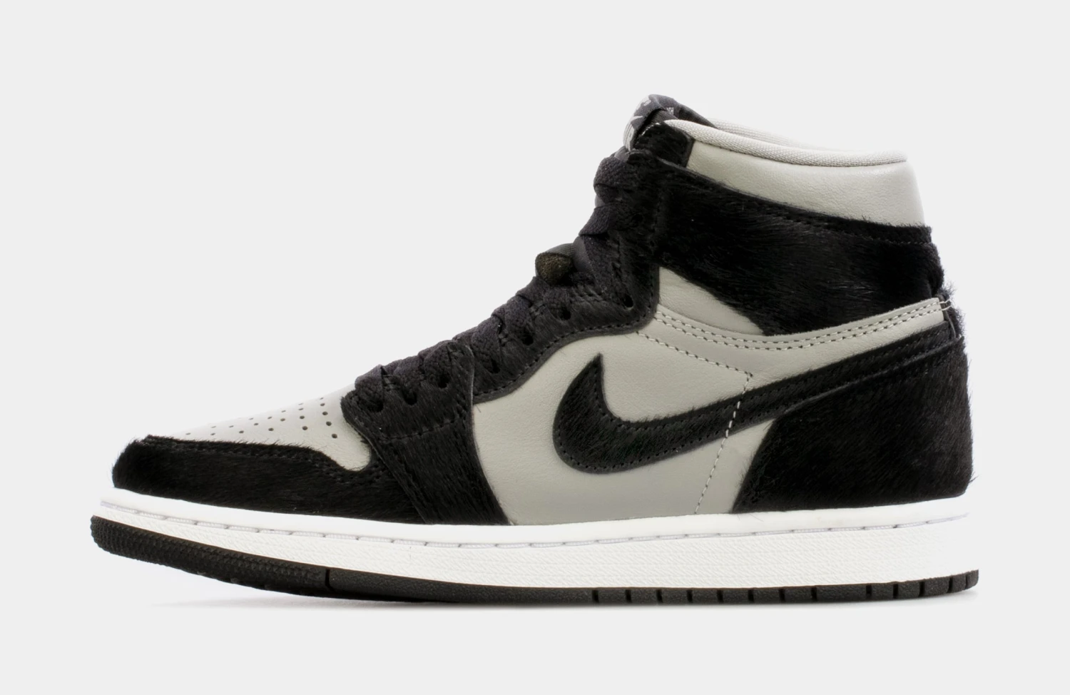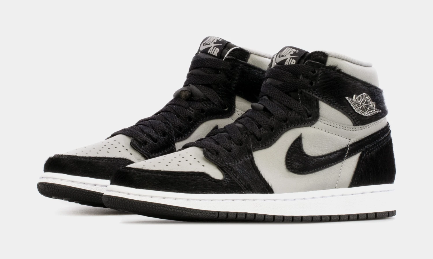Dressed in a Medium Grey, Black, and White color scheme. This offering of the Air Jordan 1 features a Light Grey leather upper with Black pony hair overlays and Swooshes. A metal Wings logos on the lateral ankle atop a White midsole and Black rubber outsole completes the design.