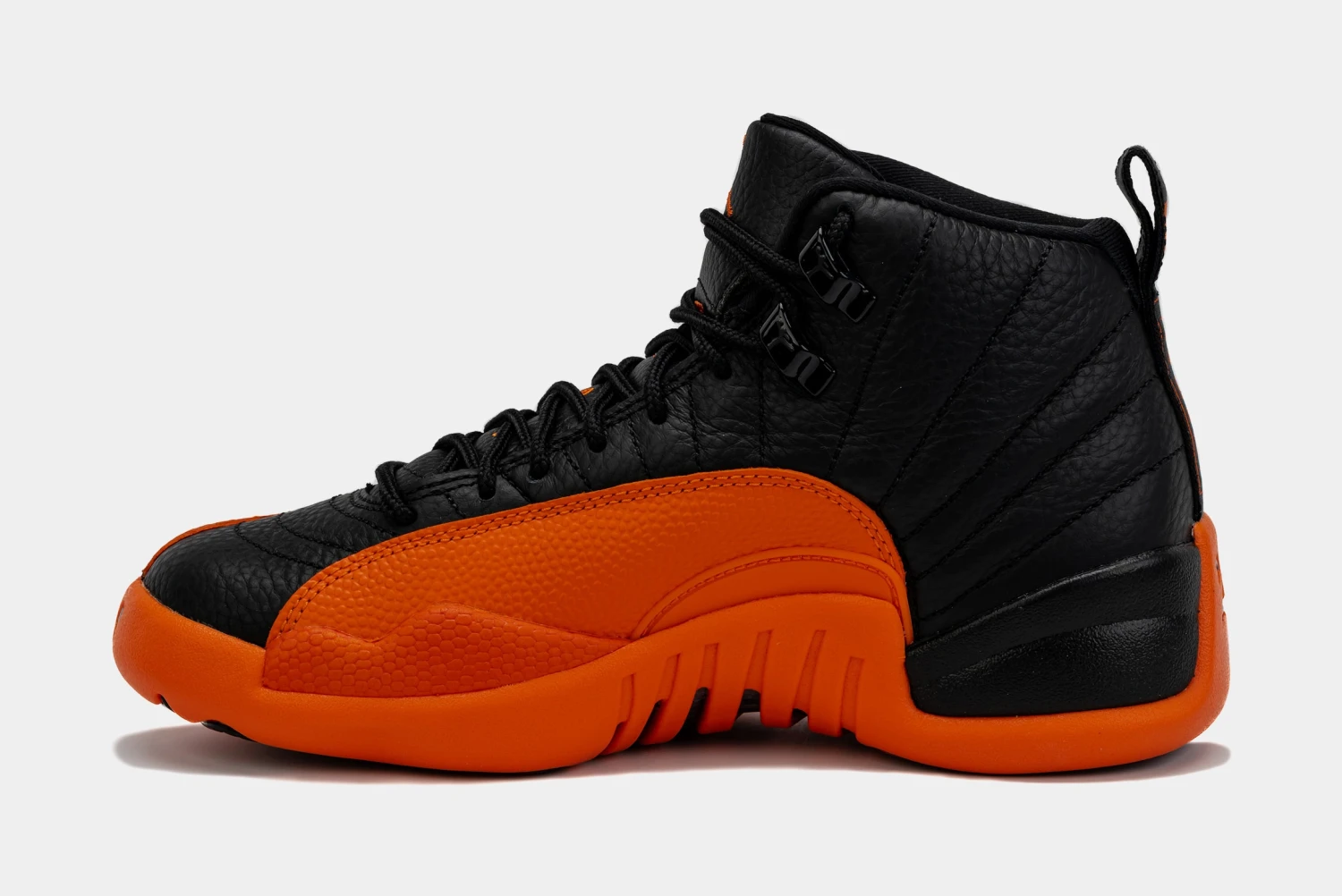 Showcasing a sleek combination of Black, Brilliant Orange, and White, this latest iteration of the Air Jordan 12 boasts a sophisticated aesthetic. Crafted with premium Black tumbled leather, the shoe features matching metal upper eyelets, laces, inner lining, and rear pull tabs. The Brilliant Orange accents on the textile mudguards, tongue and heel branding, and rubber outsole with Black traction create eye-catching contrasts