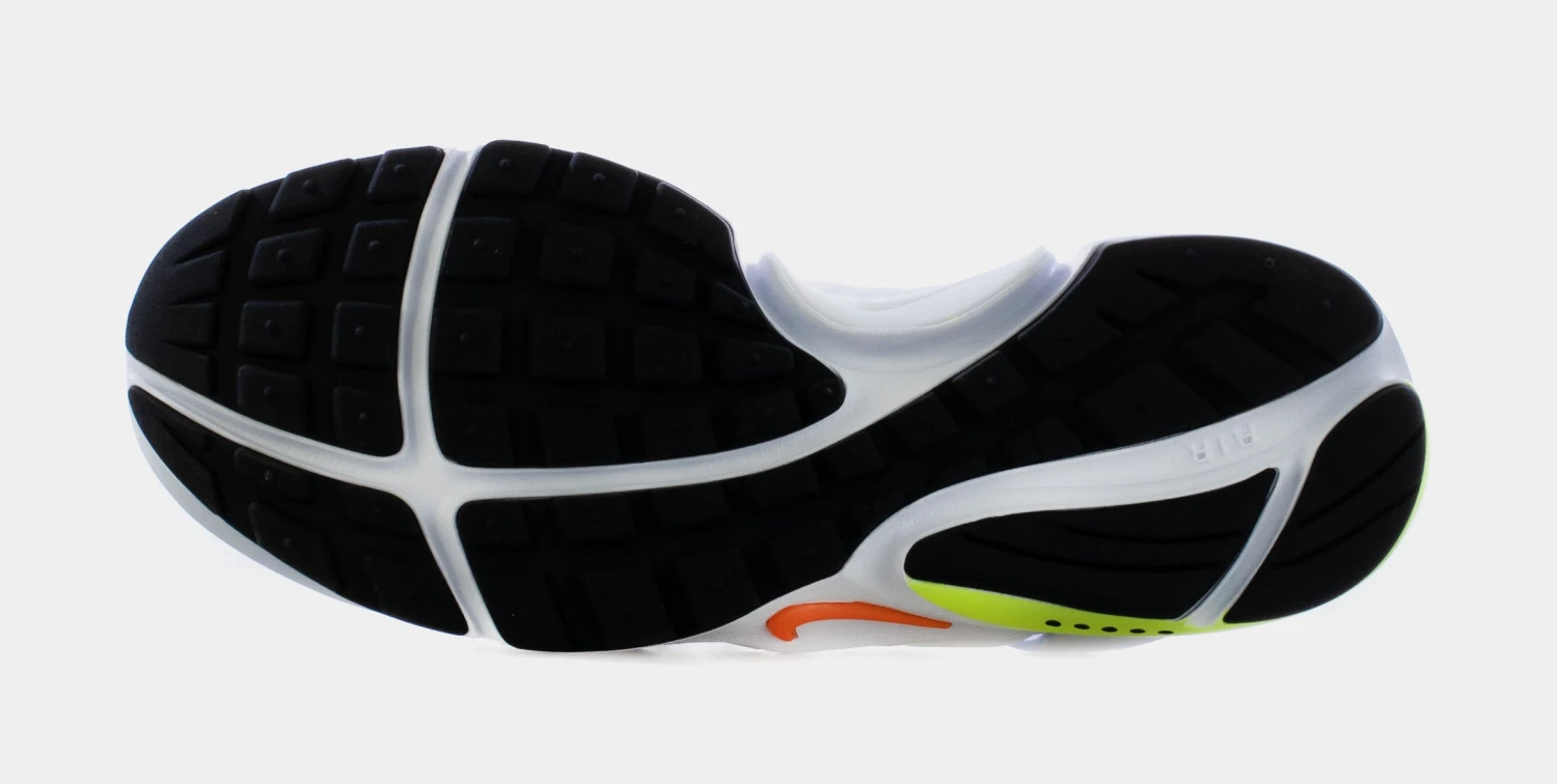 This offering of the Nike Air Presto features a White and Blue stretchy mesh base with a White lace cage overlay, laces and midsole. Highlighting the shoe are Volt and Orange contrasting accents atop a Black rubber outsole to complete the design.